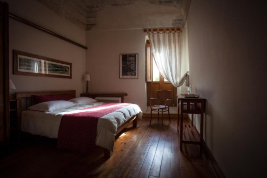 Camera (18 mq) letto matrimoniale. Pavimento in legno e soffitto con gli antichi decori .Con vista su una piccola strada non trafficata o sulla piazza e la chiesa di San Pantaleo (piccolo balcone)