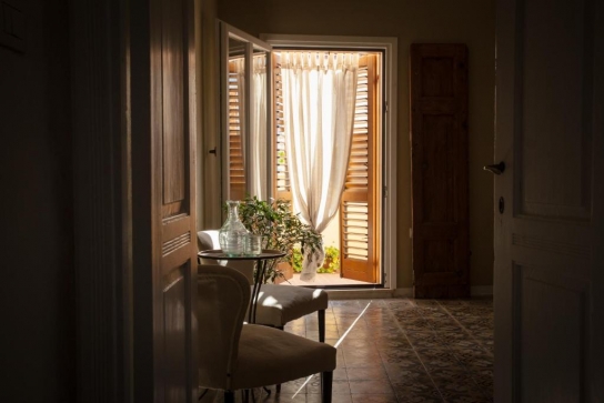 2 Camere (45 mq). Un letto matrimoniale e due letti sigoli. Con pavimento in antica graniglia e soffitto originario in legno .Con vista su una piccola strada non trafficata e sulla piazza e la chiesa di San Pantaleo (piccolo balcone)